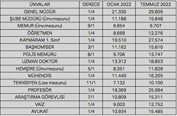 4 milyon memur ve 2 milyondan fazla memur emeklisinin 2022 ve 2023'teki mali ve sosyal haklarının belirlendiği 6. Dönem Toplu Sözleşme görüşmelerine göre bu yılın ikinci yarısı için yüzde 7 ve enflasyon farklarından oluşan zam yapıldı. Bu artışlar neticesinde Temmuz 2022 dönemi itibarıyla bazı kamu görevlilerinin net görev aylıkları şu şekilde belirlendi: