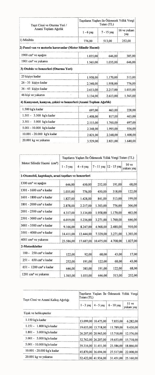 1-6 yaş arası minibüslerden 776 lira, 7-15 yaş arası olanlardan 513 lira vergi alınacak. Yeni yılda 1-6 yaş arası 1,900 cm3 ve aşağısı motor hacmine sahip olan minibüslerden bin 35 lira, 1,901 cm3 ve yukarısı motor hacmine sahip olanlardan bin 565 lira vergi alınacak.