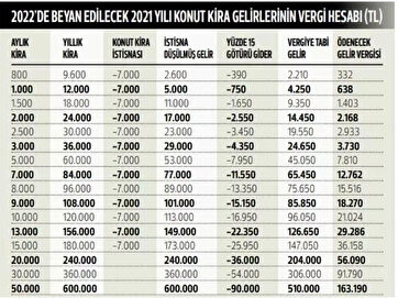 Hürriyet’ten Ahmet Karabıyık şu detayları yazdı; "Geçen yıl (2021’de) elde ettiği konut kira geliri 7 bin lirayı aşmayanlar beyanname vermeyecek. Beyanname vermeyen mülk sahipleri kira gelirleri için vergi de ödemeyecek. 7 bin liranın üzerinde konut kira geliri olanlar, mart ayı içinde beyanname verecek. Hissedarlar için de aynı tutar geçerli. Kişi başı elde edilen konut kira geliri 7 bin lirayı geçmiyorsa beyanname verilmeyecek. Konut kira geliri; hissedar başına 7 bin lirayı geçtiği andan itibaren, her bir hissedar ayrı ayrı 7 bin liralık istisnayı vergi hesabında gelirinden düşebiliyor. Bir kişi, birden fazla konuttan kira geliri elde etmesi halinde, kira gelirleri toplamına bir defa (7 bin lira) istisna uygulanabilecek.