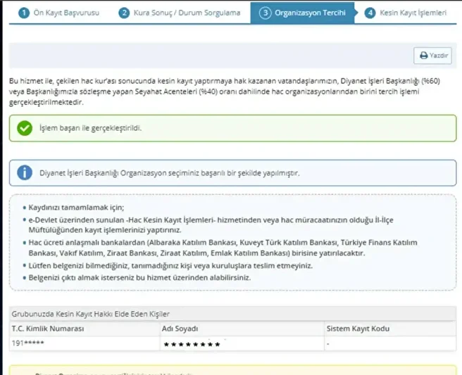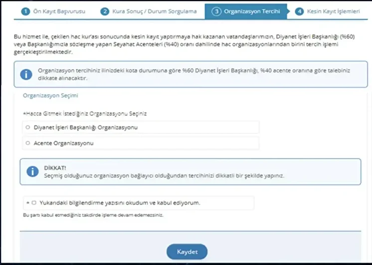 Hac kesin kayıtları, e-Devlet üzerinden kolayca yapılabiliyor. Adaylar, Türkiye Cumhuriyeti Kimlik Numarası ve e-Devlet şifresiyle giriş yaparak Hac İşlemleri kısmına ulaşabiliyor. Kayıt işlemi, hac organizasyonu tercihi ile başlar. İki seçenekten biri tercih edilir: Diyanet İşleri Başkanlığı Organizasyonu ya da Acenta Organizasyonu. Hacı adaylarının tercihi, hac yolculuklarını nasıl gerçekleştireceklerini belirleyecektir.