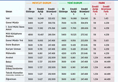 Bakanlık, birinci derece ve 30 yıl hizmeti olan devlet memurlarını esas alarak ek gösterge artışının bazı unvanların emekli aylık ve ikramiyelerine etkisine ilişkin tablo da hazırladı.