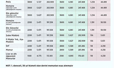 Düzenlemeyle, birinci derece memur olmak kaydıyla tüm öğretmenlerin, 2 yıl ve üzeri yükseköğrenim mezunu polislerin, alan sınırlaması olmaksızın 4 yıllık yükseköğrenim mezunu sağlık çalışanları ile din görevlilerinin ek göstergeleri 3600'e yükseltilecek.