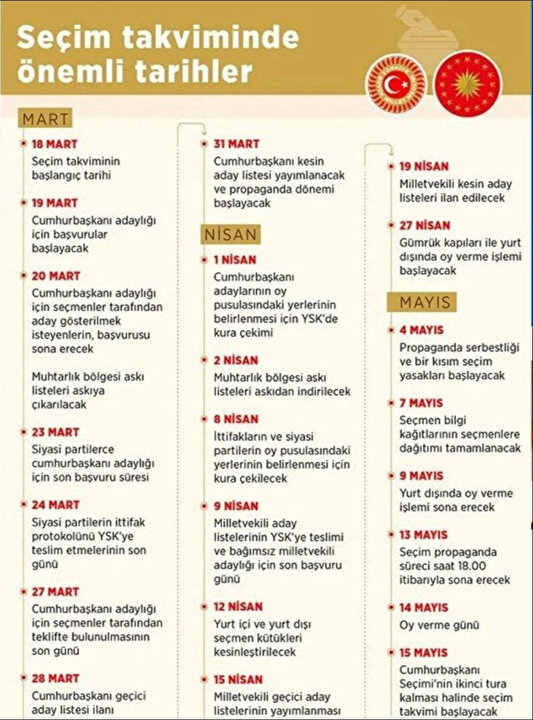 12 Nisan: Yurt içi ve yurt dışı seçmen kütükleri kesinleştirilecek. Yurt içi seçmenlerin oy vereceği yer ve sandıklar belirlenecek.
