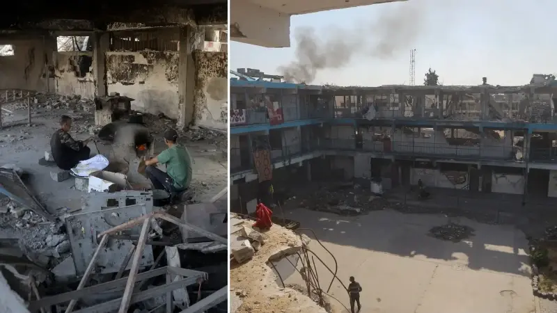 Yağışlar nedeniyle çadırlarını su basan bazı Filistinli aileler Han Yunus'ta bir okula sığındı