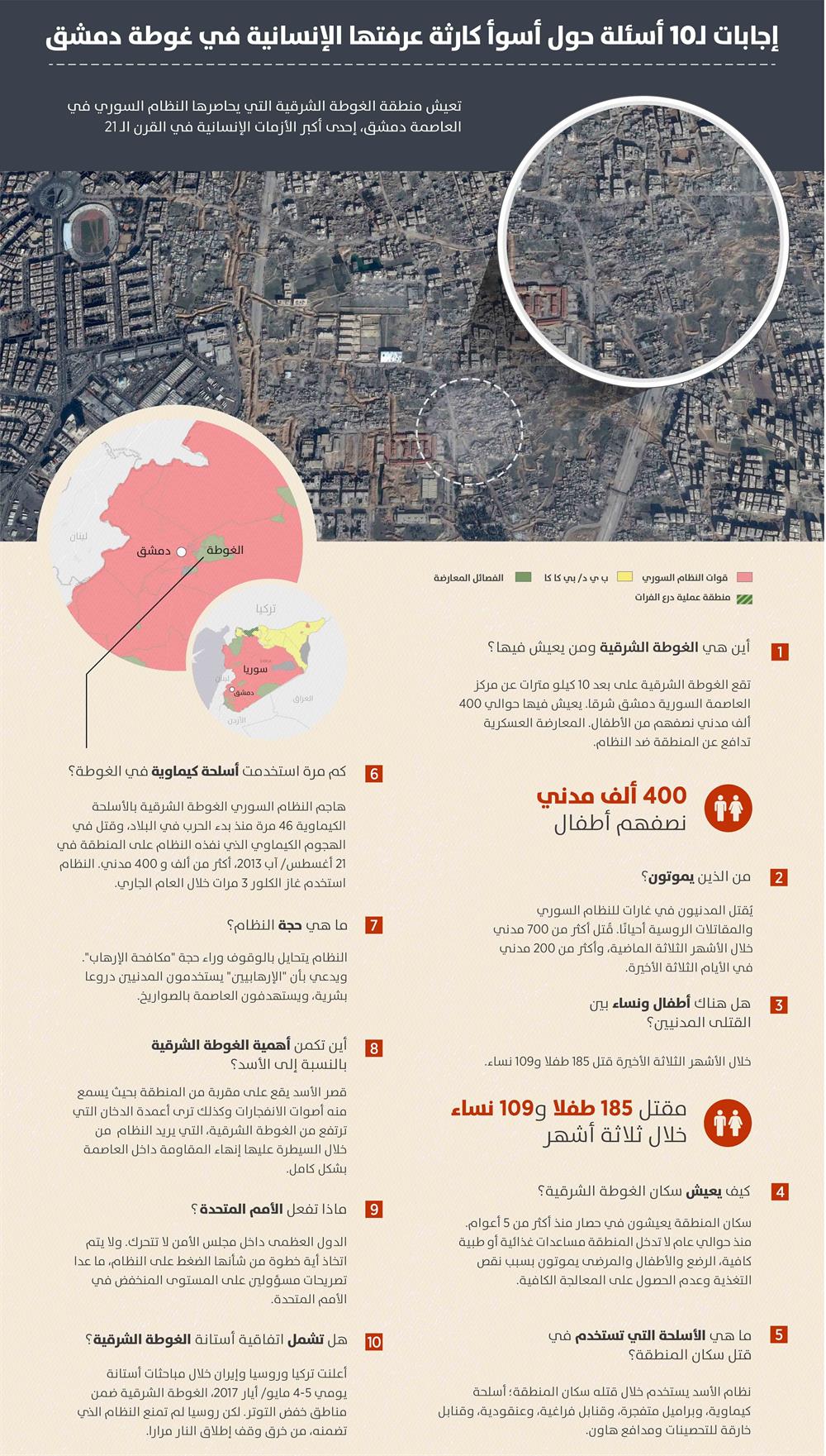 وتتعرّض الغوطة، التي يقطنها نحو 400 ألف مدني، منذ أسابيع لحملة عسكرية تعتبر الأشرس من قبل النظام السوري وداعميه، أدّت إلى مقتل وإصابة مئات المدنيين بينهم نساء وأطفال.