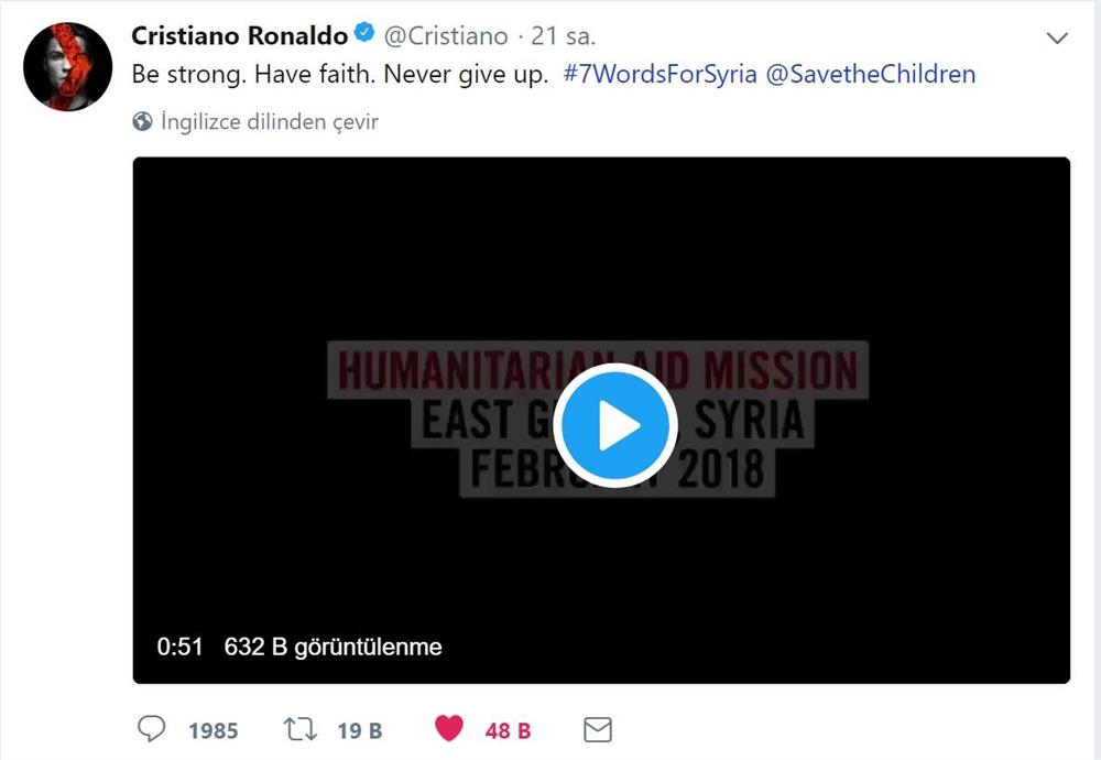 وعبّر رونالدو عن تضامنه مع سكان الغوطة، عبر تسجيل مصور لمنظمة "Save the Children"، نشره عبر حسابه على "تويتر"، مساء الثلاثاء.