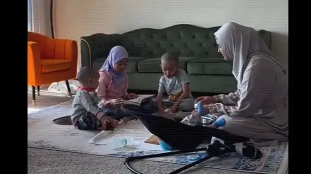 سيدة أجنبية تتلو آيات من القرآن بصوت مؤثر، وأطفالها الأربعة يرددون وراءها بخشوع بينما يشاركونها إعداد الطعام في لحظة عائلية مفعمة بالإيمان والسكينة.