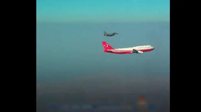 فيديو يظهر استقبال سرب من الطائرات المقاتلة التابعة لسلاح الجو السلطاني العُماني لطائرة الرئيس أردوغان عقب دخولها أجواء سلطنة عمان، في مشهد يعكس حفاوة الاستقبال.