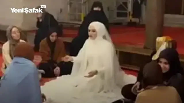 إلينا، سيدة مولدوفية اعتنقت الإسلام قبل 5 سنوات، ظهرت في يوم زفافها بفستان العروس داخل أحد مساجد إسطنبول وهي تدعو سائحة ألمانية إلى الإسلام.
