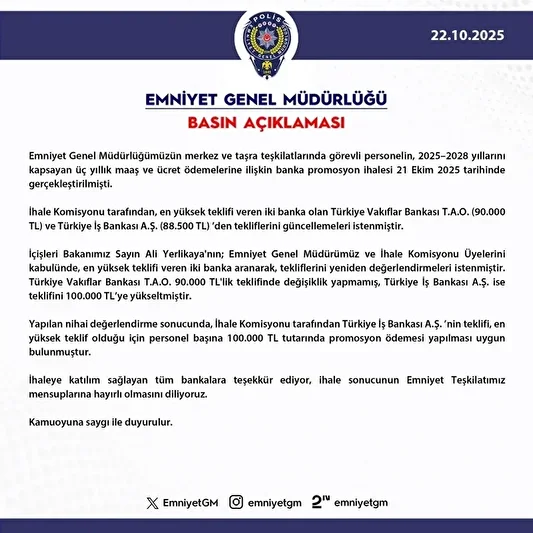 Son dakika haberi: Emniyet Genel Müdürlüğü (EGM), personelin maaş ve ücret ödemelerine ilişkin 2025-2028 yıllarını kapsayan banka promosyon ihalesinde, Türkiye İş Bankasının 100 bin liralık teklifinin kabul edildiğini bildirdi. İçişleri Bakanı Ali Yerlikaya, sosyal medya hesabından yaptığı açıklamada "Emniyet Teşkilatımızın tüm değerli mensuplarına hayırlı olması dileğimle." ifadelerini kullandı. İşte EGM promosyonundan son gelişmeler ve resmi açıklamalar.