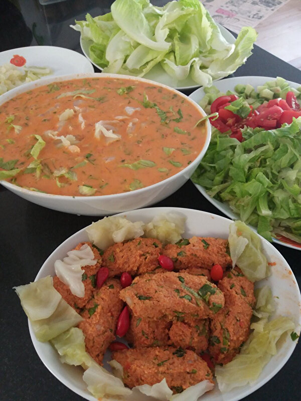 Bulguru ıslatacak kadar üzerinde sıcak su gezdirin. 15 dakika dinlendirin. Salçaları, soğanı, yer fıstığını ve yağı ekleyip 15 dakika yoğurun. Salçaları, soğanı, yer fıstığını ve yağı ekleyip 15 dakika yoğurun.