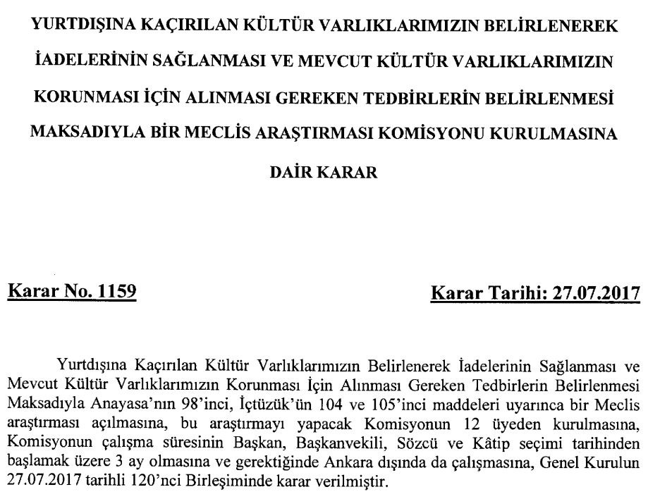 Yasadışı yollarla kaçırılan Anadolu'nun zengin tarihinin, ait olduğu topraklara getirilmesini sağlayacak araştırma komisyonu kurulması için Meclis'teki dört parti, TBMM Başkanlığı'na başvurdu. Komisyonun amacı, "Anadolu’nun kültür varlıklarının korunması ve kaçırılan varlıkların Türkiye’ye iadesini teminen Meclis iradesini göstermek" olacak.