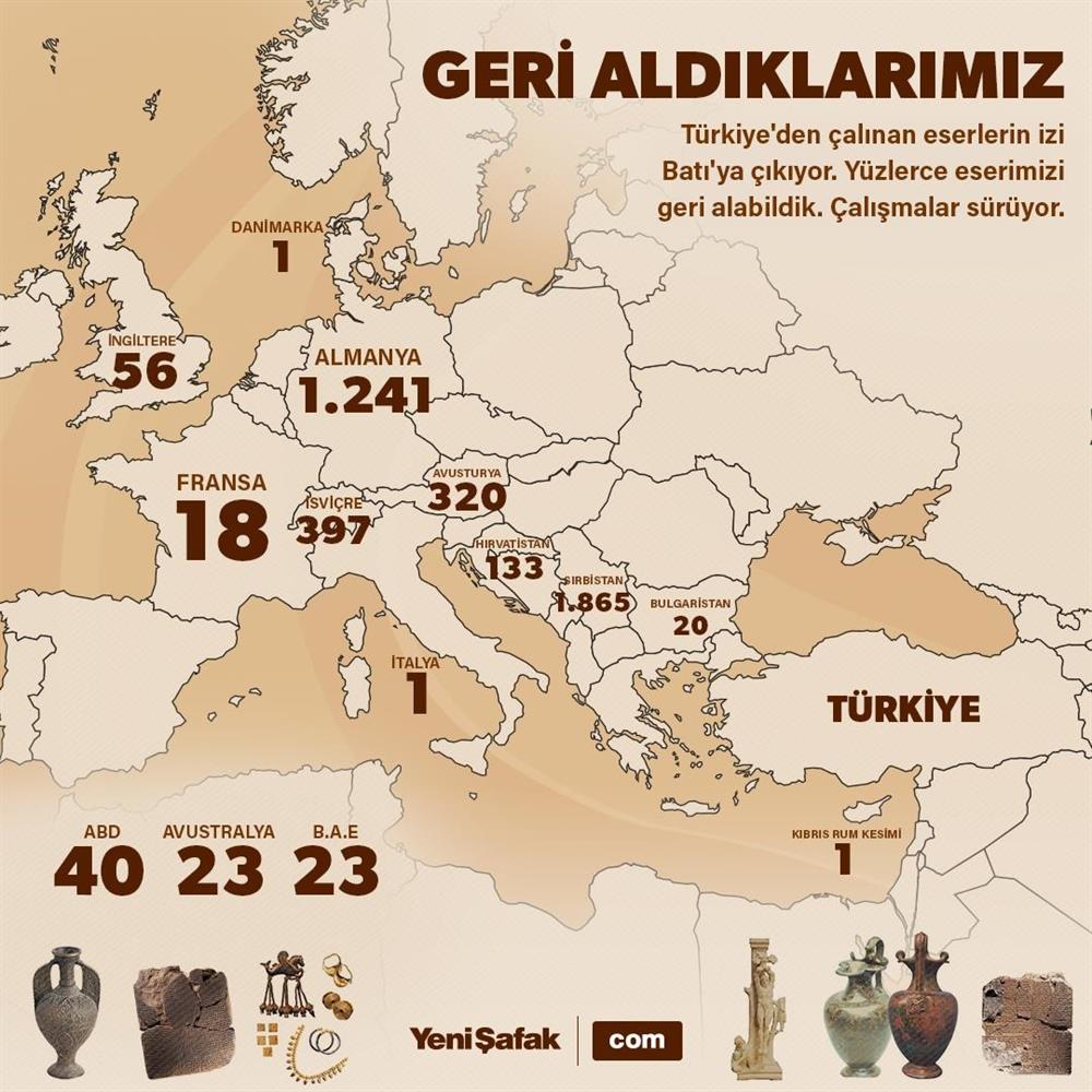 Almanya’da Anadolu’dan kaçırılan Boğazköy Sfenksi, Bergama-Zeus Sunağı, Aphrodisias-İhtiyar Balıkçı Heykeli, Konya-Beyhekim Camii Mihrabı, Hacı İbrahim Veli Türbesi ve Troya eserleri bulunurken, ABD’de de Lidyalılar, Hititler, Urartular, Pers ve Mezopotamya dönemlerinden kalma çok sayıda eser bulunuyor.