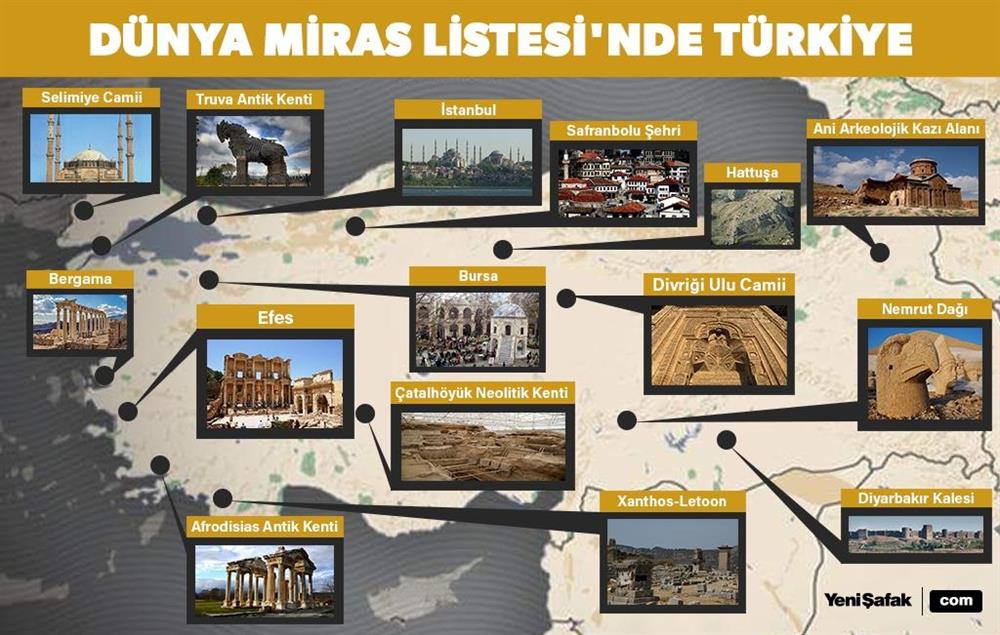 Türkiye'den 17 varlık, Miras Listesi'nde yer alıyor. Son güncelleme bu yıl yaşandı. Aydın'daki Afrodisias ile bu sayıya ulaşıldı. Listede 15 varlık 'kültür' bölümünde yer alırken, 2 varlık ise kültürel ve doğal karma bölümde bulunuyor.