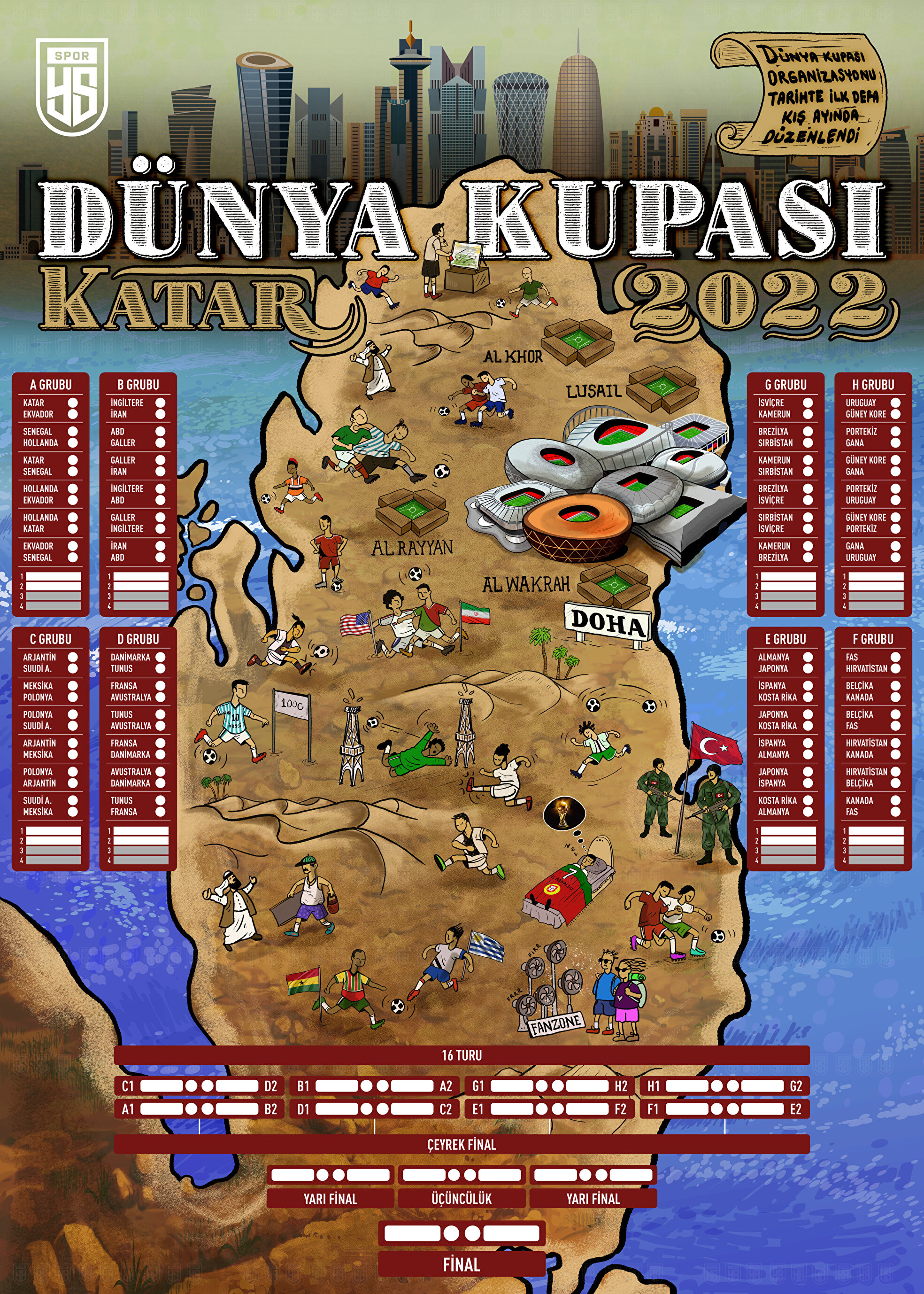 - 20 Kasım günü Katar'ın Al Bayt Stadyumu'nda başlayan Dünya Kupası, 18 Aralık'ta Lusail Iconic stadyumunda oynanacak final maçıyla tamamlanacak.