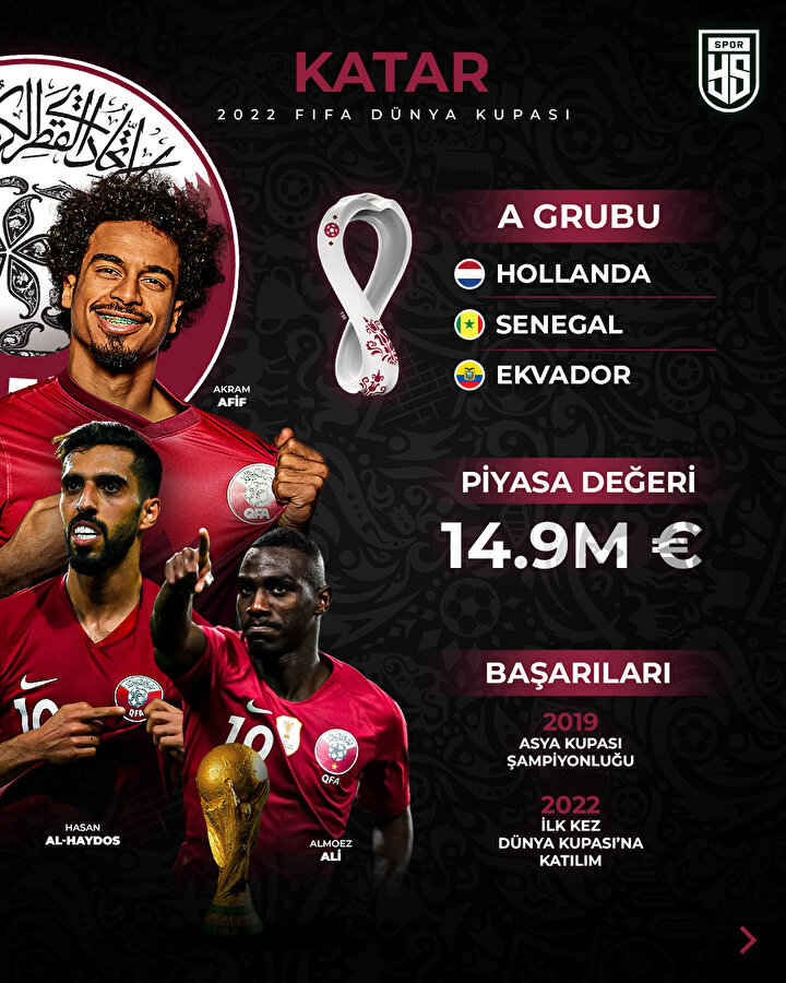 Yıldız ikilisi olarak Akram Afif ve ligde gol kralı olan Almonez Ali gösterilebilir. Ev sahibi avantajını kullanarak turnuvada adından söz ettirmeyi hedefleyen Bordo-Beyazlıların teknik direktörlüğünü, 2017 yılından bu yana İspanyol teknik adam Felix Sançez yapıyor. Sançez’in Katar’daki oyun tarzında ülkesinden esinlendiğini söylemek gerekir.