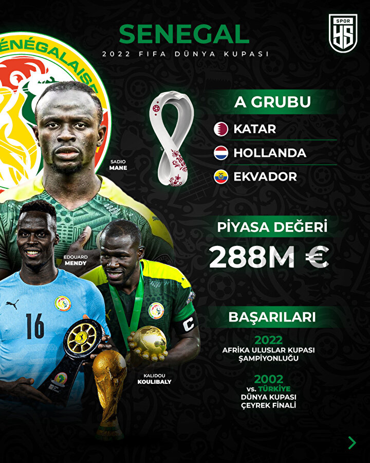 Dünya Kupası’na Afrika Şampiyonu unvanıyla gelen Senegal, yıllardır üst turlara çıkamayan Afrika ülkeleri arasındaki en iddialı takım. 2018 Dünya Kupası’nda yer alan Senegal, grubu üçüncü sırada tamamlayarak turnuvaya veda etmişti.