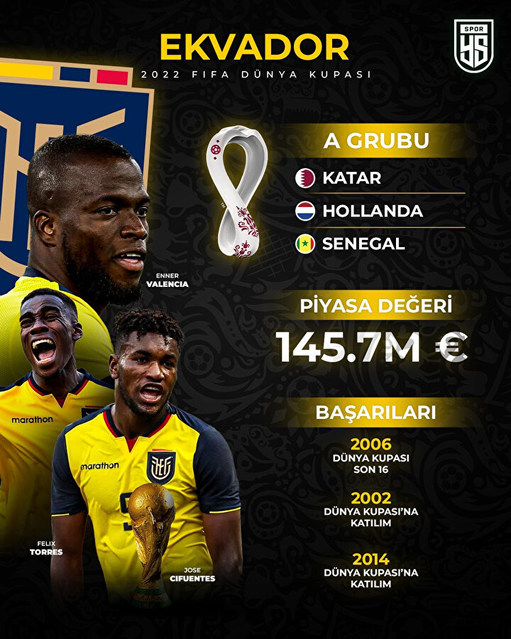 - Genç bir takım olmasına rağmen birçok deneyimli oyuncuyu da kadrosunda barından Güney Yarım Küre Ekibi, Fenerbahçe’de forma giyen ve Milli Takım kaptanlığı yapan Enner Valencia’ya bir hayli güveniyor. Yıldız futbolcu, 2014 Yılında Brezilya’da düzenlenen Dünya Kupası’nda Ekvador adına en golcü isim olmuştu.