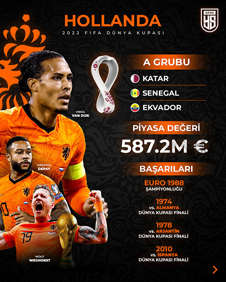 Daha önce Dünya Kupası’nda 3 kez final oynayan Hollanda, kupayı hiç kazanamadı. Portakallar, Katar’a gelirken 15 maçlık yenilmezlik serisi ve deneyimli teknik adam Luis Van Gaal’in tecrübesine güveniyor. 2018 Rusya’ya katılamayan Hollanda, Katar 2022’ye renk katması beklenen takımlardan bir tanesi.