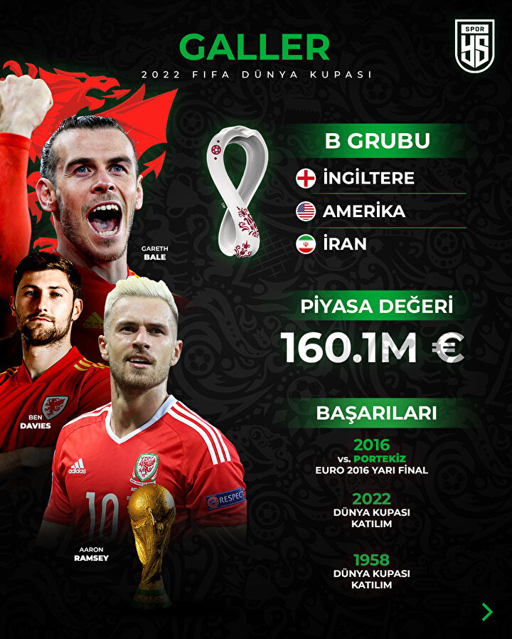 - B Grubu’ndaki tüm maçlarını Ahmed Bin Ali Stadı’nda oynanacak olan Galler, son randevusuna İngiltere karşısında çıkacak. Galler Basını, grubun ağır Favorisi İngiltere’nin ilk iki maçta turu garantilemesi halinde, Galler’in son maçını bu ekiple yapmasının avantaj olabileceğine İnanıyor.