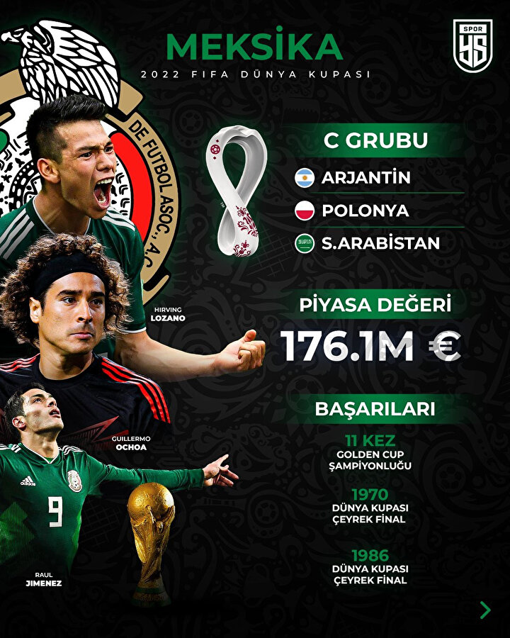 Yıllardır Dünya Kupası turnuvalarına renk katan Meksika, 2022 Katar’da da kendisine yer buldu. Katıldığı Son 7 turnuvada son 16’ya ulaşan ancak çeyrek final göremeyen Meksika, bu kez daha ilerisini hedefliyor.