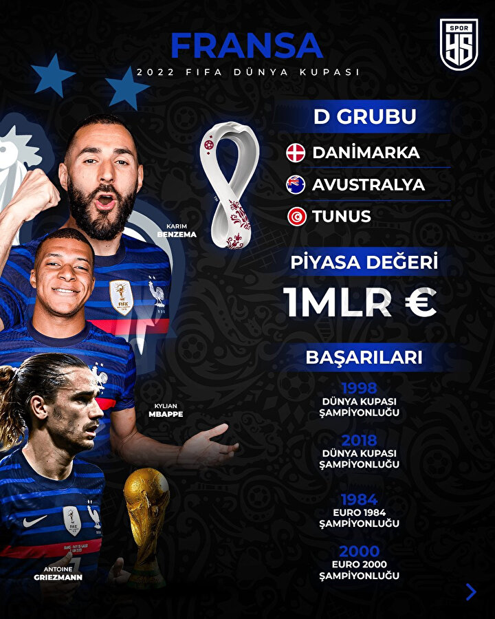 Tecrübeli ve genç futbolcuların yer aldığı alternatifli kadrosuyla dikkati çeken Fransa, üst üste ikinci kez dünya futbolunun milli takımlar düzeyindeki bir numaralı organizasyonunda zirvede yer almaya çalışacak.