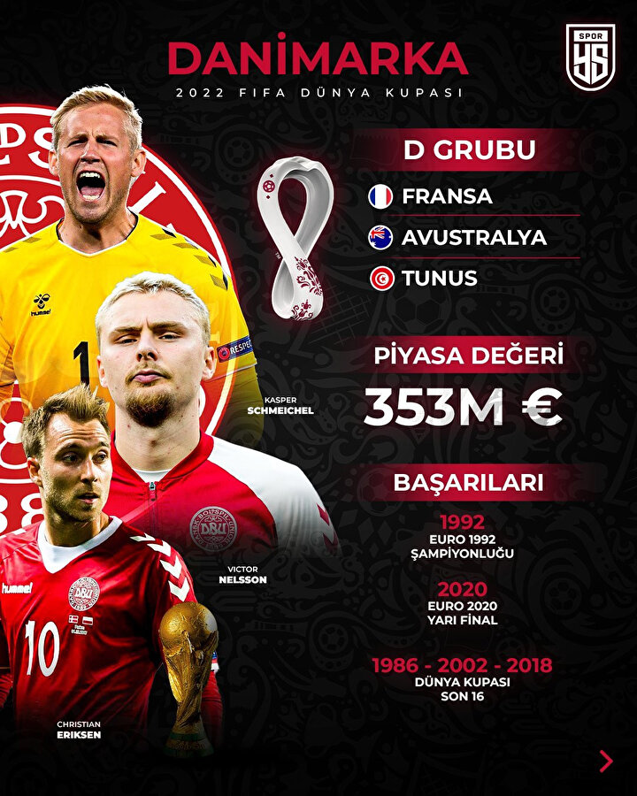 Katar'ın ev sahipliği yapacağı 2022 FIFA Dünya Kupası'nda mücadele edecek Danimarka Milli Futbol Takımı, Fransa 1998'de ulaştığı çeyrek final başarısının üzerine çıkmaya çalışacak.