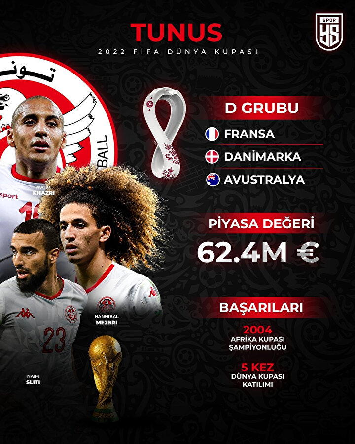 Kasımpaşa'da forma giyen Mortadha Ben Ouanes'in de kadrosunda yer aldığı Tunus, orta sahada görev yapan Ellyes Skhiri ve Hannibal Mejbri gibi oyuncularla D Grubu'nda sürpriz yapmaya çalışacak.
