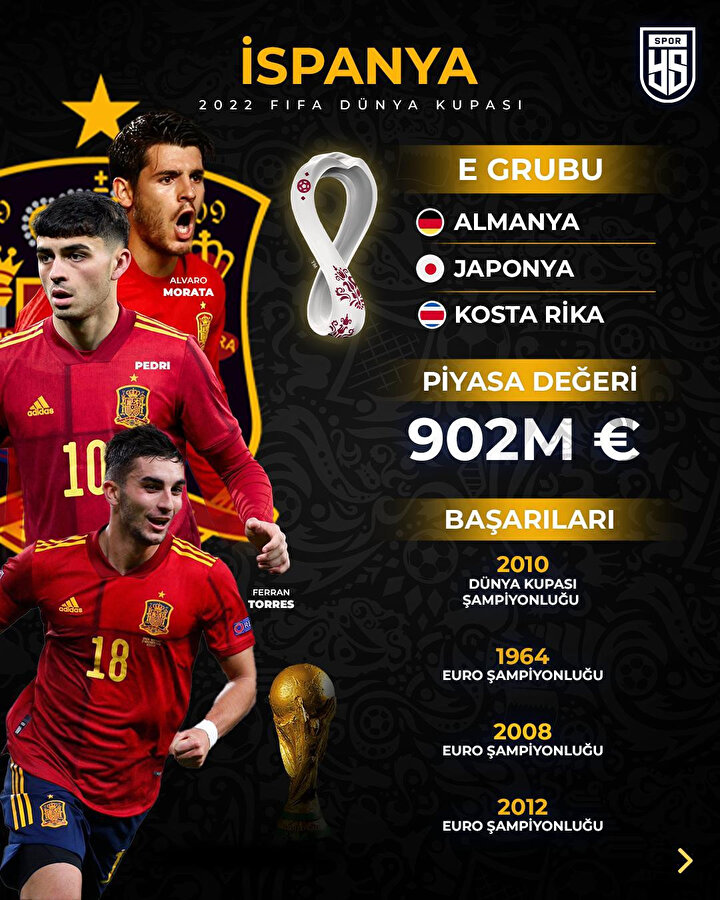 Dünya ve Avrupa şampiyonluğu apoletleri bulunan Sergio Busquets ile Jordi Alba gibi iki önemli ismin tecrübesine güvenen İspanya, Dünya Kupası'nda Pedri, Gavi ve Ferran Torres gibi genç oyuncularının ekstra performansıyla başarı kovalayacak.