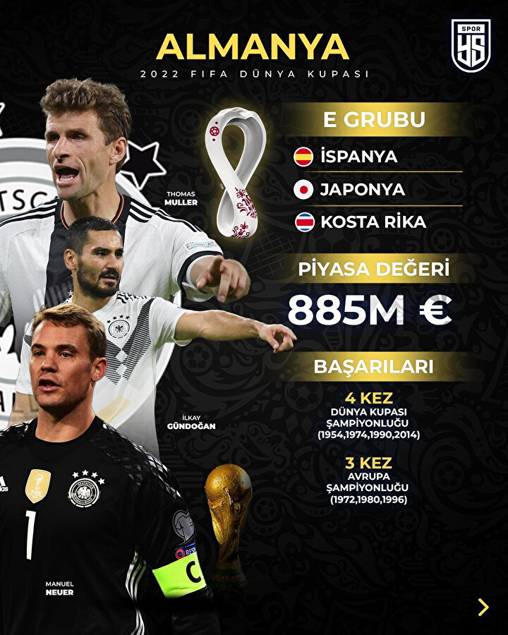 Panzerler, Antonio Rudiger, Kai Havertz, Thomas Müller, Joshua Kimmich, Serge Gnabry ve İlkay Gündoğan gibi isimlerin sergileyeceği performansla "Turnuva takımı" imajını Katar'da tekrar futbolseverlere göstermek için mücadele edecek.