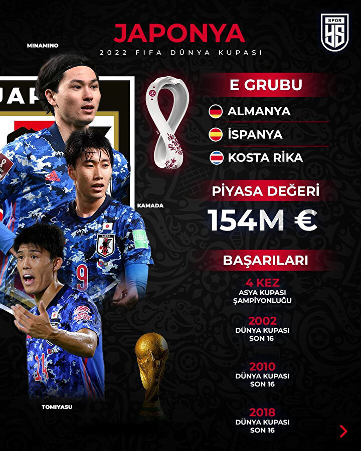 1998'den bu yana tüm Dünya kupalarına katılan Japonya, Katar 2022'ye de renk katmaya çalışacak. Teknik direktör Mariyasu'nun turnuvada en büyük kozu, Avrupa'nın önemli liglerinde forma giyen oyuncuların sayısının çokluğu olacak. Kalede Eiji Kawashima'nın tecrübesine güvenen Japonya, savunmada Takehiro Tomiyasu, orta sahada Daichi Kamada ve hücumda Takefusa Kubo gibi önemli oyuncularla organizasyonda başarı için ter dökecek.
