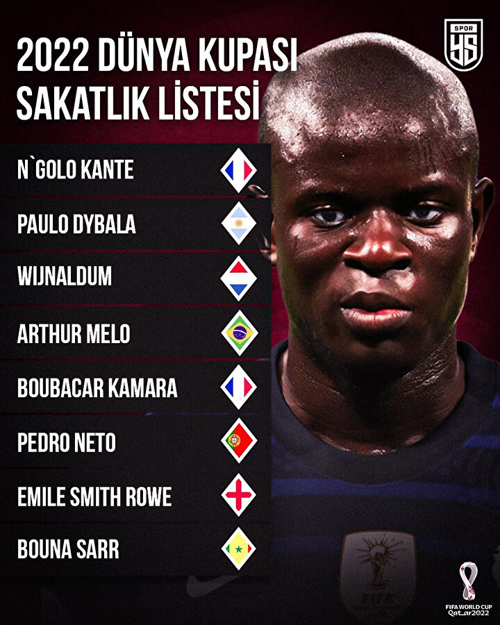 - Fransa'da son dünya şampiyonluğunun mimarlarından N'Golo Kante ile her zaman milli takımda sergilediği ekstra performansla takdir toplayan Paul Pogba, sakatlıkları nedeniyle Katar'da sahne alamayacak.