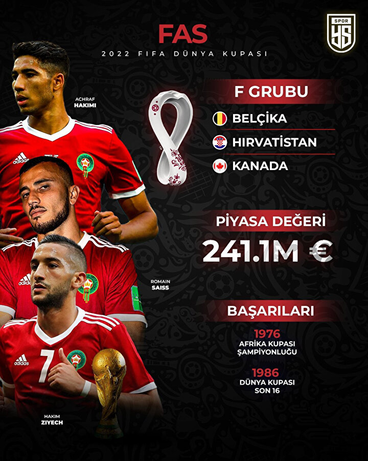 Önceki Dünya kupalarında Noureddine Naybet, Mustapha Hadji, Ahmed Faras gibi önemli oyuncuların forma giydiği Fas, bu turnuvada ise Sevilla forması giyen Youssef En Nesyri, PSG'de oynayan Achraf Hakimi, Chelsea forması giyen Hakim Ziyech ve Bayern Münih forması giyen Noussair Mazraoui gibi yıldız isimlerine güveniyor.