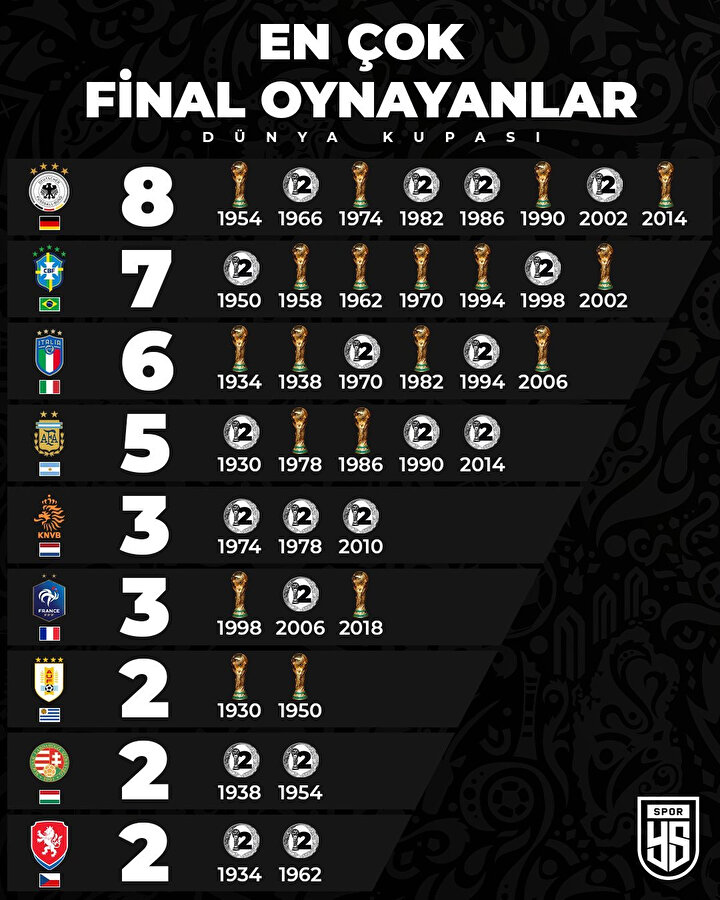 - Almanya Milli Takımı, Dünya Kupası'na 19 kez katıldı. Panzerler, 1954, 1974, 1990 ve 2014'te şampiyonluk ipini göğüslemeyi başardı. Almanya, 4'er kez ise ikinci ve üçüncü oldu.