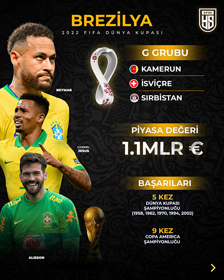 Brezilya, futbol dünyasına kazandırdığı yıldız isimlerle ön plana çıkıyor. Daha önceki turnuvalarda Pele, Jairzinho, Zico, Garrincha, Ronaldo ve daha birçok yıldız oyuncunun forma giydiği Brezilya, 2022 FIFA Dünya Kupası'na yıldız oyuncusu Neymar önderliğinde geliyor. Brezilya'nın forvet hattında Real Madrid'den Vinicius Junior ve Barcelona'dan Raphinha da diğer önemli isimler olarak dikkat çekiyor.