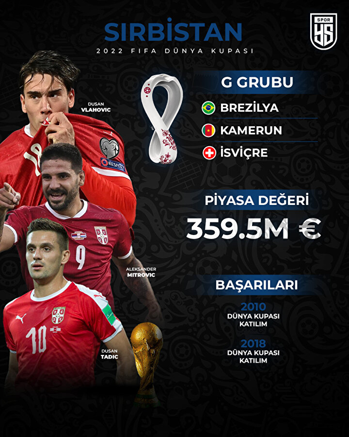 Katar'ın ev sahipliği yapacağı 22. Dünya Kupası'nda Sırbistan, G Grubu'nda mücadele edecek.