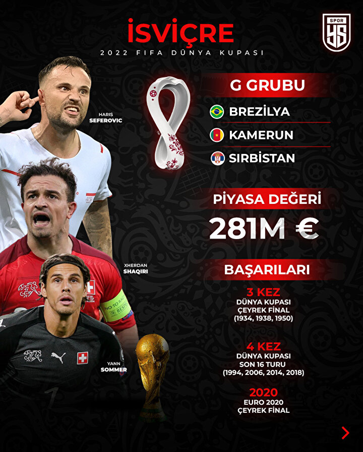 Katar'ın ev sahipliği yapacağı 22. Dünya Kupası'nda İsviçre, G Grubu'nda mücadele edecek.