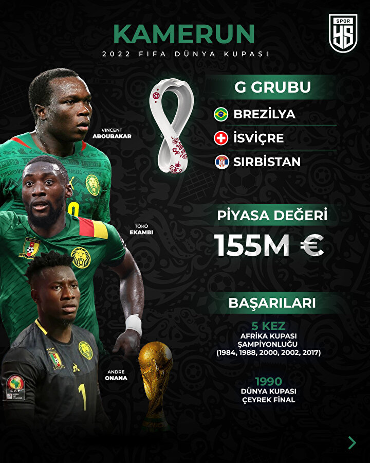 Katar'ın ev sahipliği yapacağı 22. Dünya Kupası'nda Kamerun, G Grubu'nda mücadele edecek.