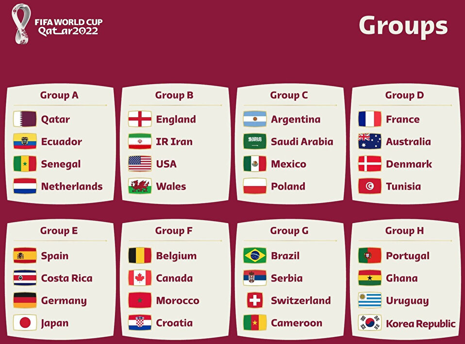 20 Kasım Pazar günü Katar'da başlayan Dünya Kupası'nda kura çekimi 1 Nisan günü Doha'da yapılmıştı. 2022 Dünya Kupası'na katılan takımlar ve yapılan kura çekimi sonrasında ortaya çıkan gruplar şu şekilde;