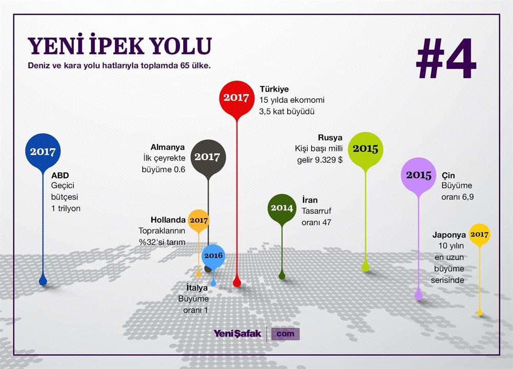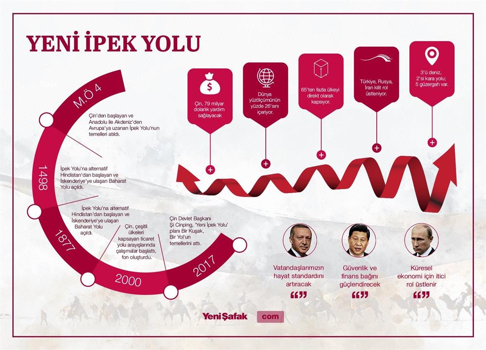 Çin'in öncülüğünde başlatılan Kuşak ve Yol Projesi, Türkiye dahil 60'dan fazla ülkeyi doğrudan kapsıyor. Proje, Çin'den Avrupa'ya kadar milyarlarca liralık altyapı ağının oluşturulmasını öngörüyor. Yatırımlar, kara ve demir yollarının inşası ve ticaretin genişlemesi planlanıyor. Kuzey koridorda Rusya, ortada Türkiye'nin, güneyde ise İran kilit rol oynuyor. Yenisafak.com, 21. yüzyılın İpek Yolu'nu Türkiye, Çin, Rusya ve İran'dan sürecin uzmanlarıyla görüştü. Ortak mesaj, küresel bir uzlaşı ortamının filizleneceği ve küresel anlamda ekonomik bir sıçrayışın yaşanacağı yönünde...