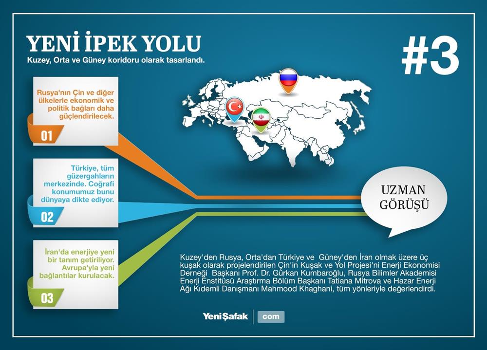 Çin'in İran'ı da kapsayan bu projesiyle birlikte enerjiye yeni bir tanım getiriliyor. Bu yol, Rusya, Türkiye ve İran'ı Avrupa'ya bağlayabilecek. İran, Türkmenistan ve Azerbeycan ile de işbirliklerine gidiyor. Türkiye'yle de önemli bağlantılarımız olacak. Bu yolla Asya'dan Avrupa'ya hem Doğu hem de Batı'dan ulaşılabilecek. Projeyle enerjiye yeni bir anlayış da getiriliyor. Enerjinin alınıp satılan bir şey olmadığı ve yüksem verimde bir servis süreci olduğu görülüyor. Türkiye-İran'ın bu noktada karşılıklı ilişkisi artacaktır.