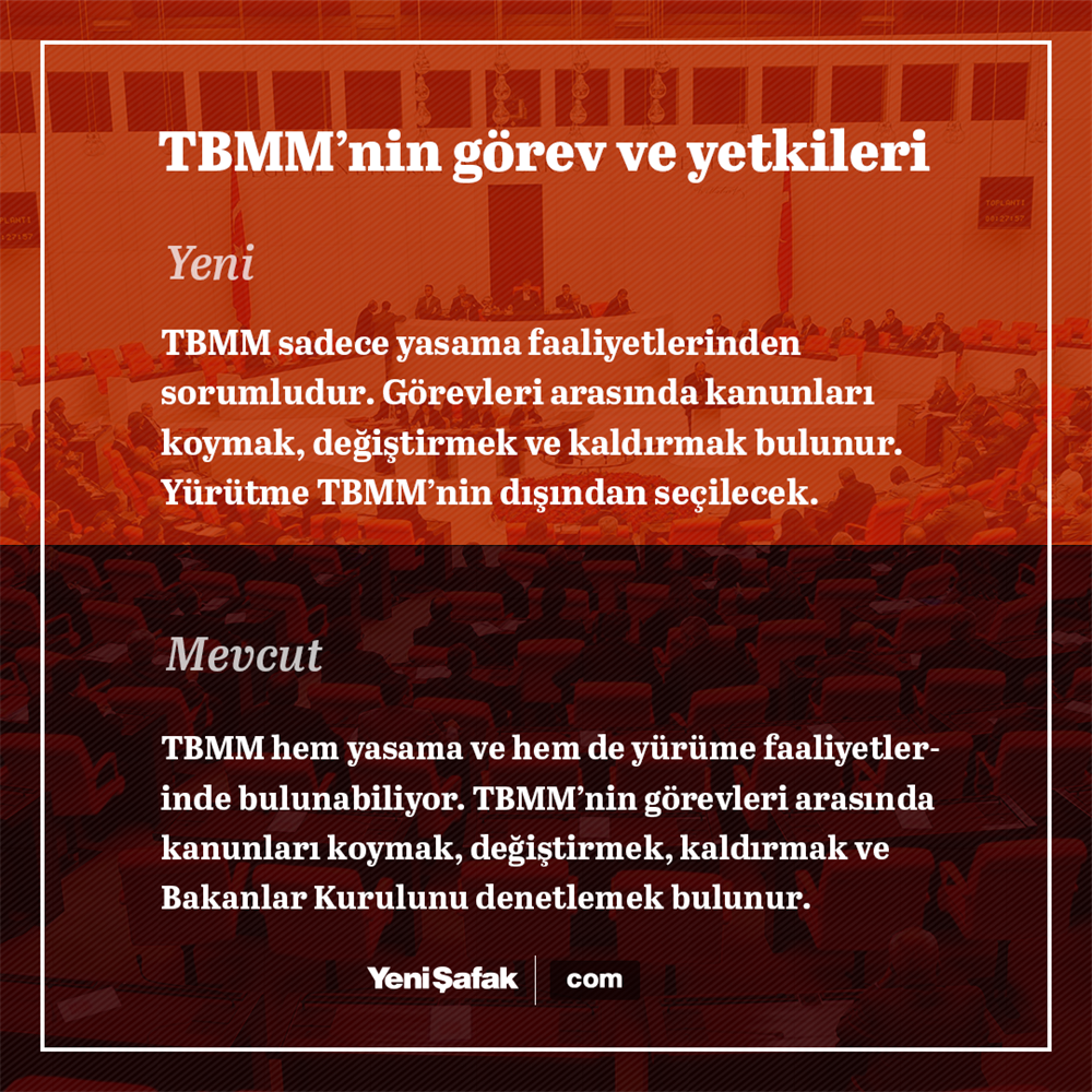 - Türkiye Büyük Millet Meclisinin görev ve yetkileri, kanun koymak, değiştirmek ve kaldırmak; bütçe ve kesinhesap kanun tekliflerini görüşmek ve kabul etmek; para basılmasına ve savaş ilânına karar vermek; milletlerarası andlaşmaların onaylanmasını uygun bulmak, Türkiye Büyük Millet Meclisi üye tam sayısının beşte üç çoğunluğunun kararı ile genel ve özel af ilânına karar vermek ve Anayasanın diğer maddelerinde öngörülen yetkileri kullanmak ve görevleri yerine getirmektir.