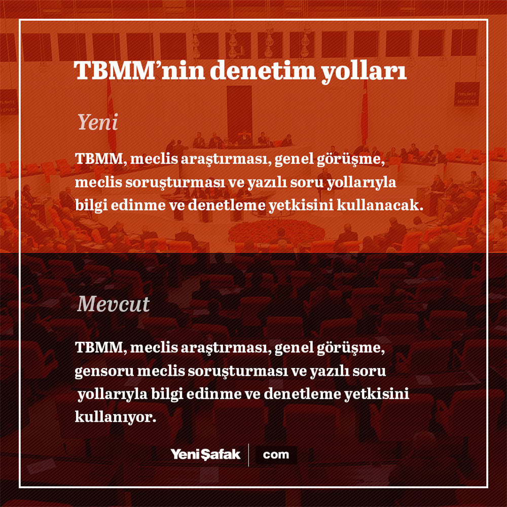 - Türkiye Büyük Millet Meclisi; meclis araştırması, genel görüşme, meclis soruşturması ve yazılı soru yollarıyla bilgi edinme ve denetleme yetkisini kullanır.