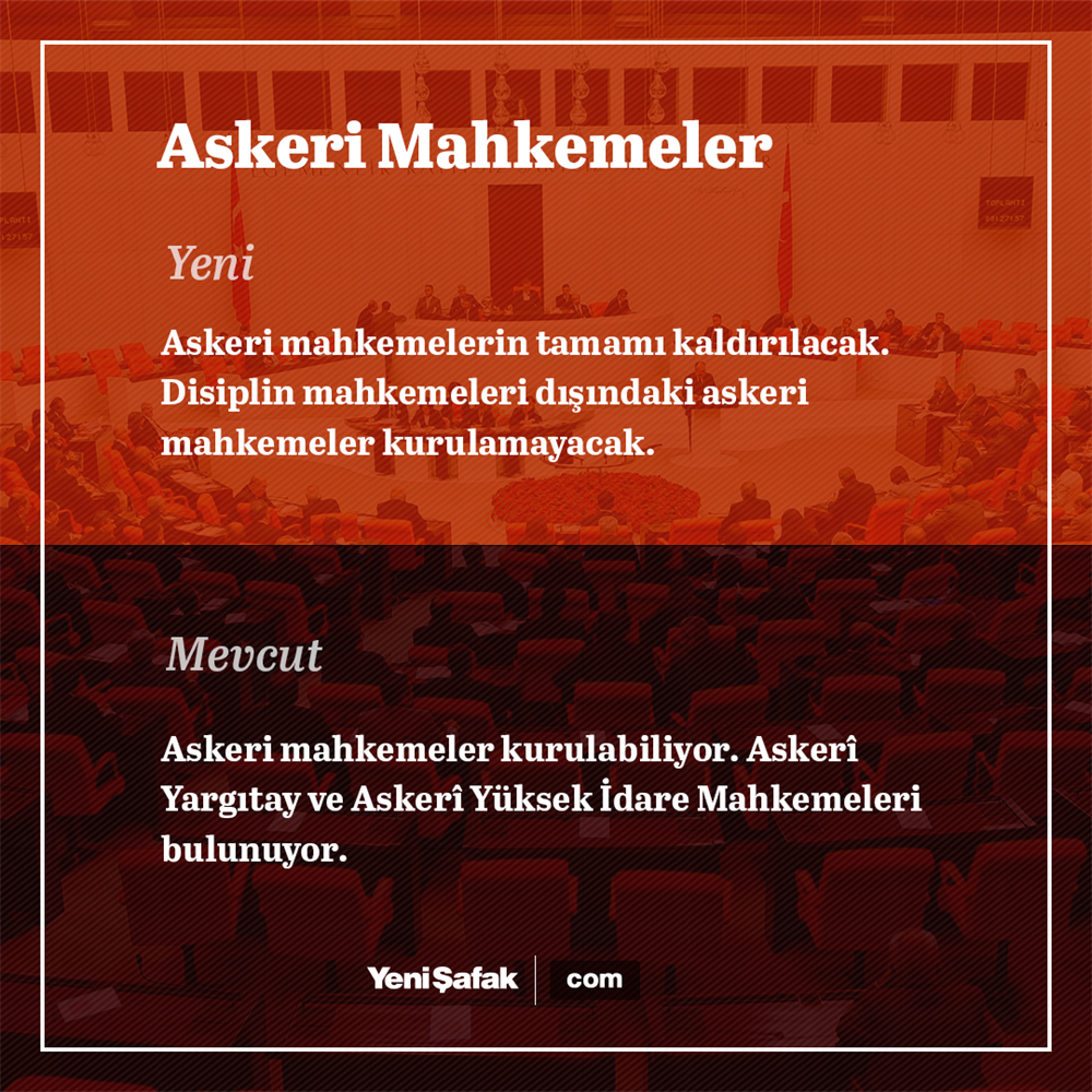 - Ç) 108 inci maddesinin birinci fıkrasına “inceleme,” ibaresinden önce gelmek üzere “idari soruşturma,” ibaresi eklenmiş; ikinci fıkrasında yer alan “Silahlı Kuvvetler ve” ibaresi madde metninden çıkarılmış; üçüncü fıkrasında yer alan “üyeleri ve üyeleri içinden Başkanı, kanunda belirlenen nitelikteki kişiler arasından,” ibaresi “Başkan ve üyeleri,” şeklinde ve dördüncü fıkrasında yer alan “kanunla” ibaresi “Cumhurbaşkanlığı kararnamesiyle” şeklinde değiştirilmiştir. D) 146’ncı maddesinin birinci fıkrasında yer alan “onyedi” ibaresi “onbeş” şeklinde değiştirilmiş, üçüncü fıkrasında yer alan “, bir üyeyi Askerî Yargıtay, bir üyeyi Askerî Yüksek İdare Mahkemesi” ibaresi ile dördüncü fıkrasında yer alan “, Askerî Yargıtay, Askerî Yüksek İdare Mahkemesi” ibareleri madde metninden çıkarılmıştır.
