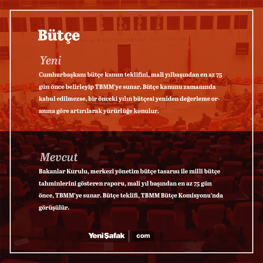 - Cumhurbaşkanı bütçe kanun teklifini, malî yılbaşından en az yetmişbeş gün önce, Türkiye Büyük Millet Meclisine sunar. Bütçe teklifi Bütçe Komisyonunda görüşülür. Komisyonun ellibeş gün içinde kabul edeceği metin Genel Kurulda görüşülür ve malî yılbaşına kadar karara bağlanır.
