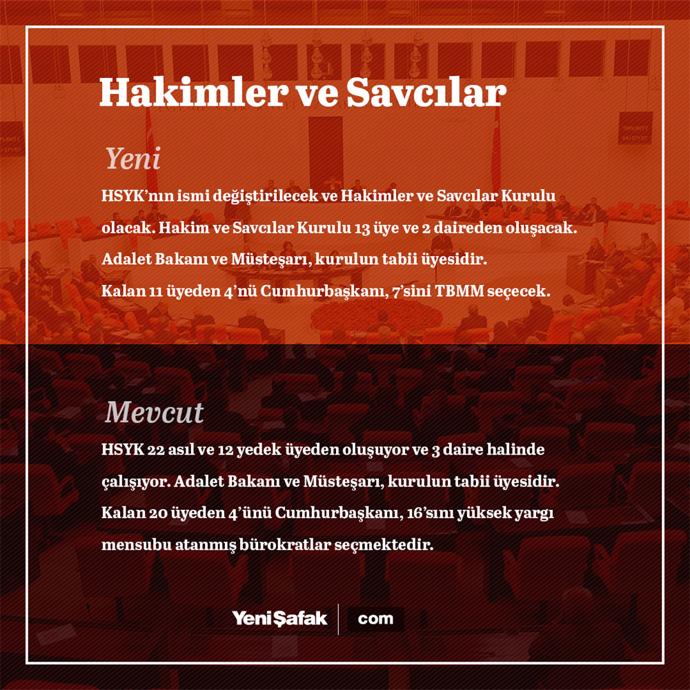 - Hâkimler ve Savcılar Kurulu onüçüyeden oluşur; iki daire hâlindeçalışır. Kurulun BaşkanıAdalet Bakanıdır. Adalet BakanlığıMüsteşarıKurulun tabiiüyesidir. Kurulun,üçüyesi birinci sınıf olup, birinci sınıfa ayrılmayıgerektiren nitelikleri yitirmemişadli yargıhâkim ve savcılarıarasından, birüyesi birinci sınıf olup, birinci sınıfa ayrılmayıgerektiren nitelikleri yitirmemişidari yargıhâkim ve savcılarıarasından Cumhurbaşkanınca;üçüyesi Yargıtayüyeleri, birüyesi Danıştayüyeleri,üçüyesi nitelikleri kanunda belirtilen yükseköğretim kurumlarının hukuk dallarında görev yapanöğretimüyeleri ile avukatlar arasından Türkiye Büyük Millet Meclisi tarafından seçilir.Öğretimüyeleri ile avukatlar arasından seçilenüyelerden, en az birininöğretimüyesi ve en az birinin de avukat olmasızorunludur. Kurulun Türkiye Büyük Millet Meclisi tarafından seçileceküyeliklerine ilişkin başvurular, Meclis Başkanlığına yapılır. Başkanlık, başvurularıAnayasa ve Adalet KomisyonlarıÜyelerinden Kurulu Karma Komisyona gönderir. Komisyon her birüyelik içinüçadayı,üye tam sayısınınüçte ikiçoğunluğuyla belirler. Birinci oylamada aday belirleme işleminin sonuçlandırılamamasıhâlinde ikinci oylamadaüye tam sayısının beşteüççoğunluğu aranır. Bu oylamada da aday belirlenemediği takdirde her birüyelik için ençok oyu alan iki aday arasında adçekme usulüile aday belirleme işlemi tamamlanır. Türkiye Büyük Millet Meclisi, Komisyon tarafından belirlenen adaylar arasından, her birüye için ayrıayrıgizli oyla seçim yapar. Birinci oylamadaüye tam sayısınınüçte ikiçoğunluğu; bu oylamada seçimin sonuçlandırılamamasıhâlinde, ikinci oylamadaüye tam sayısının beşteüççoğunluğu aranır.İkinci oylamada daüye seçilemediği takdirde ençok oyu alan iki aday arasında adçekme usulüileüye seçimi tamamlanır.