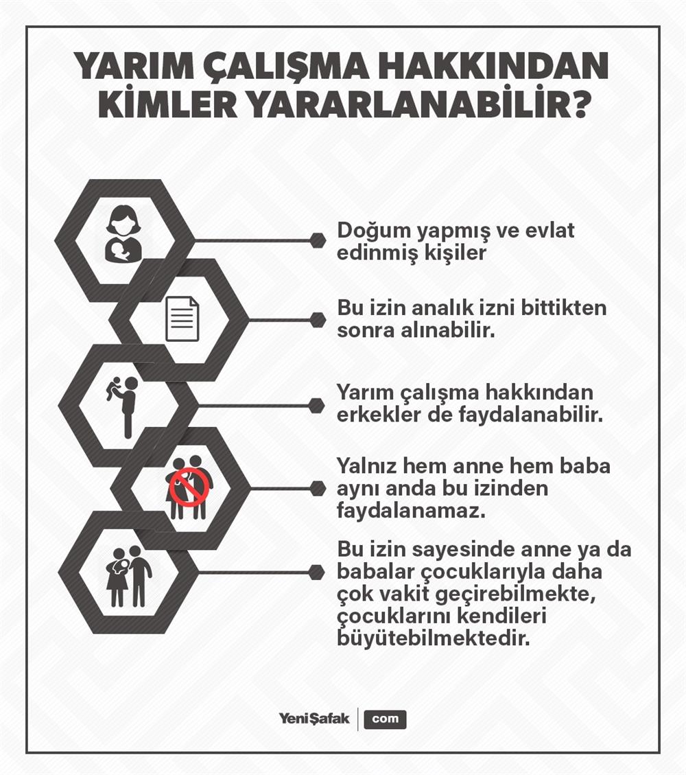 süreyle haftalık çalışma süresinin yarısı kadar ücretsiz izin verileceği, çoğul doğum halinde bu sürelere 30’ar gün ekleneceği, çocuğun engelli doğması halinde bu sürelerin 360 gün olarak uygulanacağı hükmü getirildi.