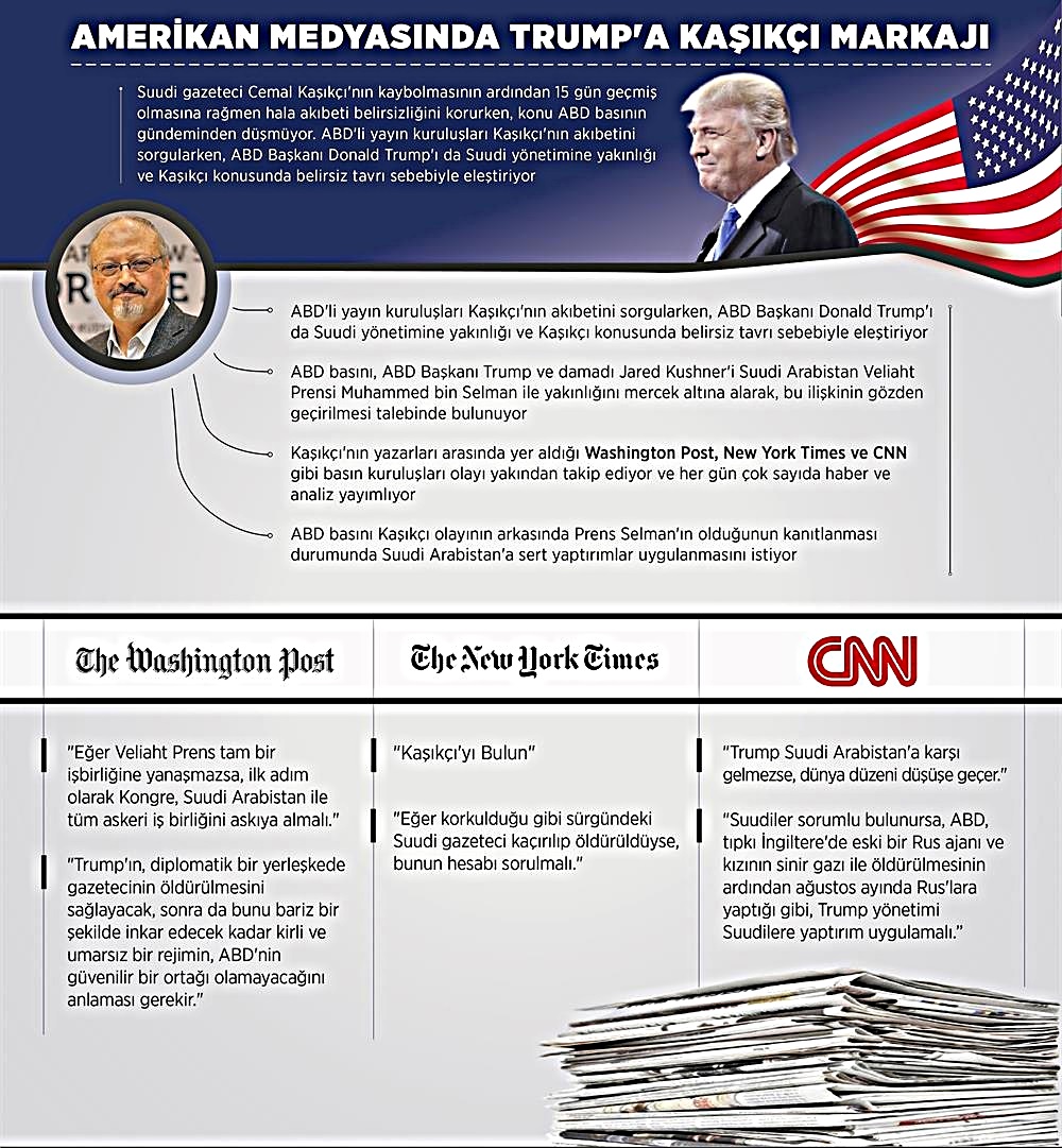 - Suudi Arabistan’ın İstanbul Başkonsolosluğu’na 2 Ekim’de gelen ve o günden beri kendisinden haber alınamayan Suudi gazeteci Cemal Kaşıkçı olayında gelişmeler yaşanıyor. Amerikan medyasında,Suudi Kralı Selman'ın Kaşıkçı’nın akıbetinin araştırılması için talimat verdiği duyuruldu.
