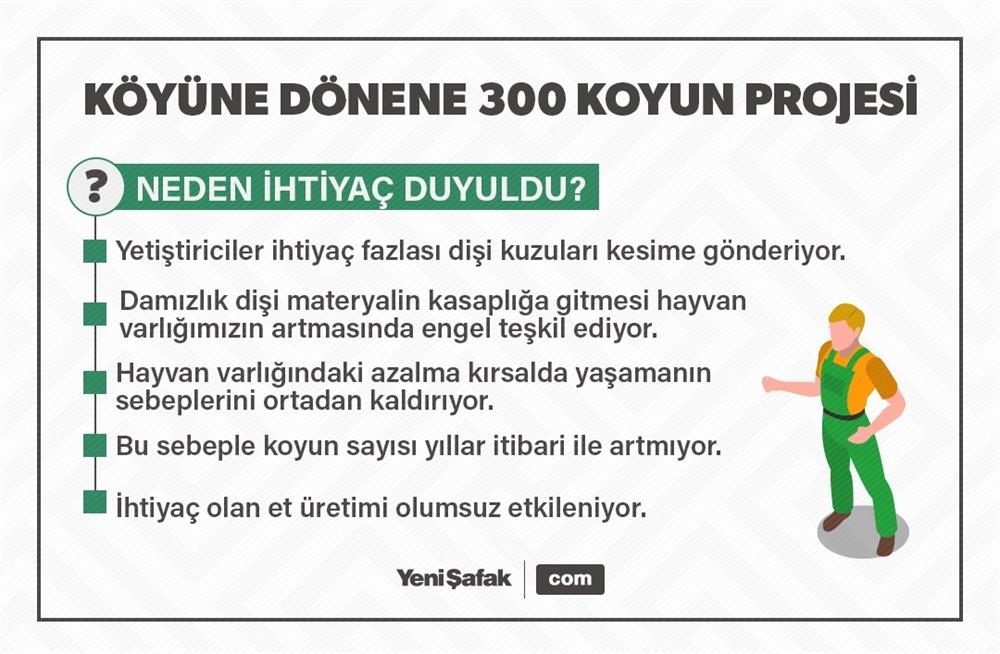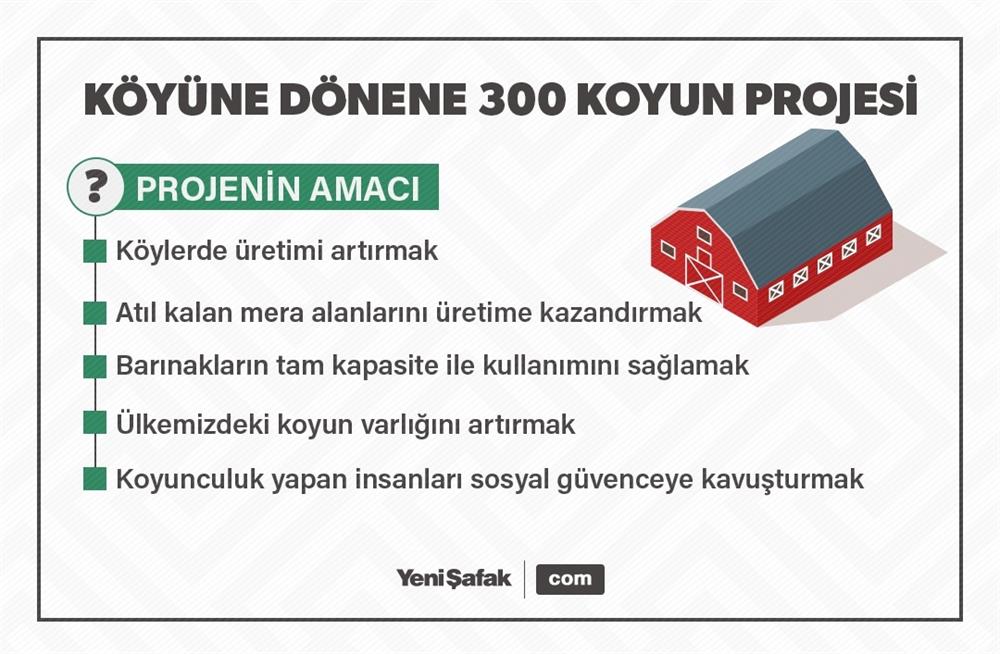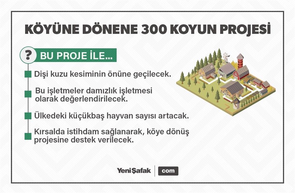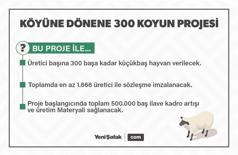 Cumhurbaşkanı Recep Tayyip Erdoğan tarafından açıklanan ve devlet desteğiyle verilecek olan ‘köyüne dönene 300 koyun’ projesinde detaylar belli oldu ve başvurular başladı. Gıda, Tarım ve Hayvancılık Bakanı Eşref Fakıbaba'nın “Köyden şehire gitme. Hem maaşını al hem kendi işinin patronu ol” açıklaması ile gündeme gelen proje büyük ilgi görüyor. Çok geniş bir kesimi kapsayan ve araştırma konusu haline gelen 300 koyun projesine nasıl başvuru yapılır? İşte, TİGEM tarafından sözleşme imzalanacak yetiştiricilere verilecek 300 başa kadar küçükbaş hayvan başvurusunda bulunmak isteyen vatandaşlar için en merak edilenler...