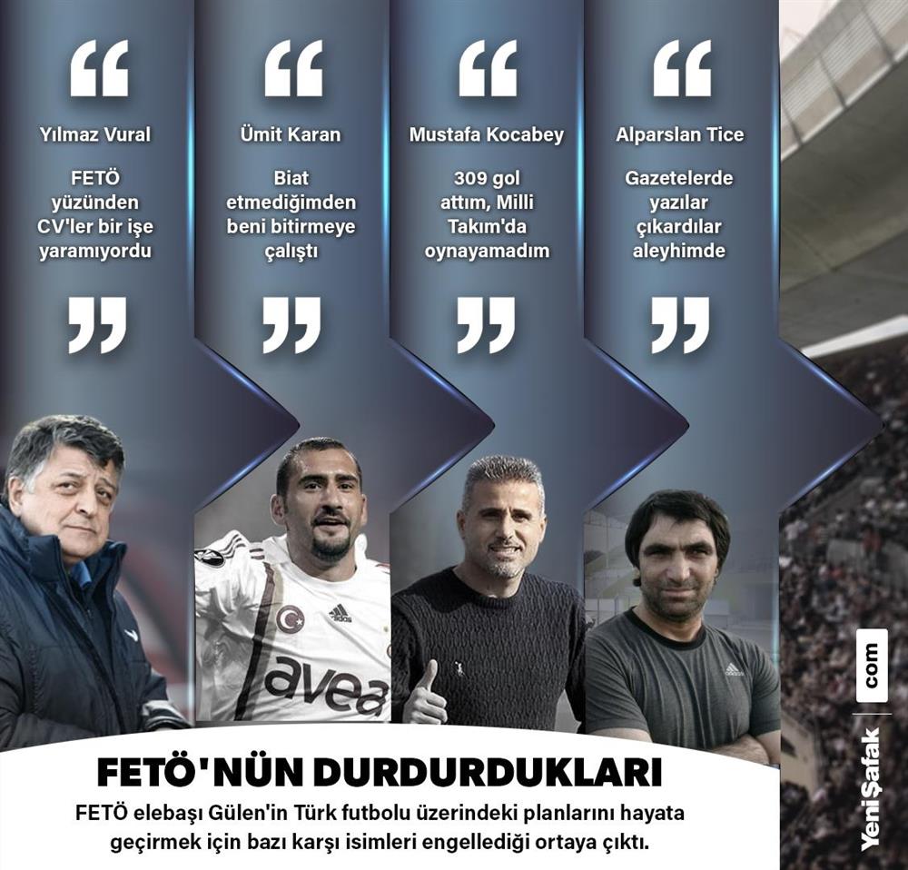 Galatasaray tarihinin önemli golcülerinden biri olan Ümit Karan, FETÖ’nün futboldaki etkisinden bahsederken kariyerinin sona ermesini örgüte bağlamıştı. Tecrübeli teknik direktör Yılmaz Vural, konuyla ilgili olarak ise “Türkiye’de birçok kişinin önü FETÖ yüzünden kesildi. Bu terör örgütü yüzünden CV’ler bir işe yaramadı” ifadelerini kullanmıştı. Eski milli takım futbolcusu Alparslan Tice de kariyerinin bitmesiyle ilgili FETÖ’yü suçlamış ve “Ben futbolcuların derslere gitmesini engellediğim için maalesef benim futbol hayatımı bitirdiler. Sürekli gazetelerde yazılar çıkarmaya başladılar aleyhimde” diye konuşmuştu.